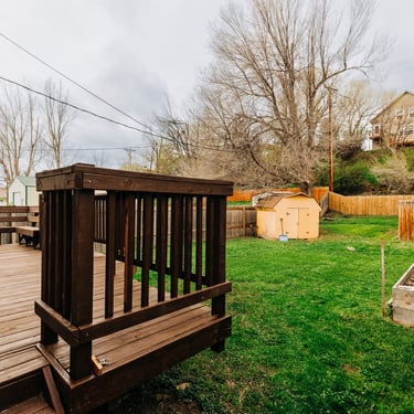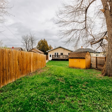 Fenced back yard with a shed. Large deck on back of house.
